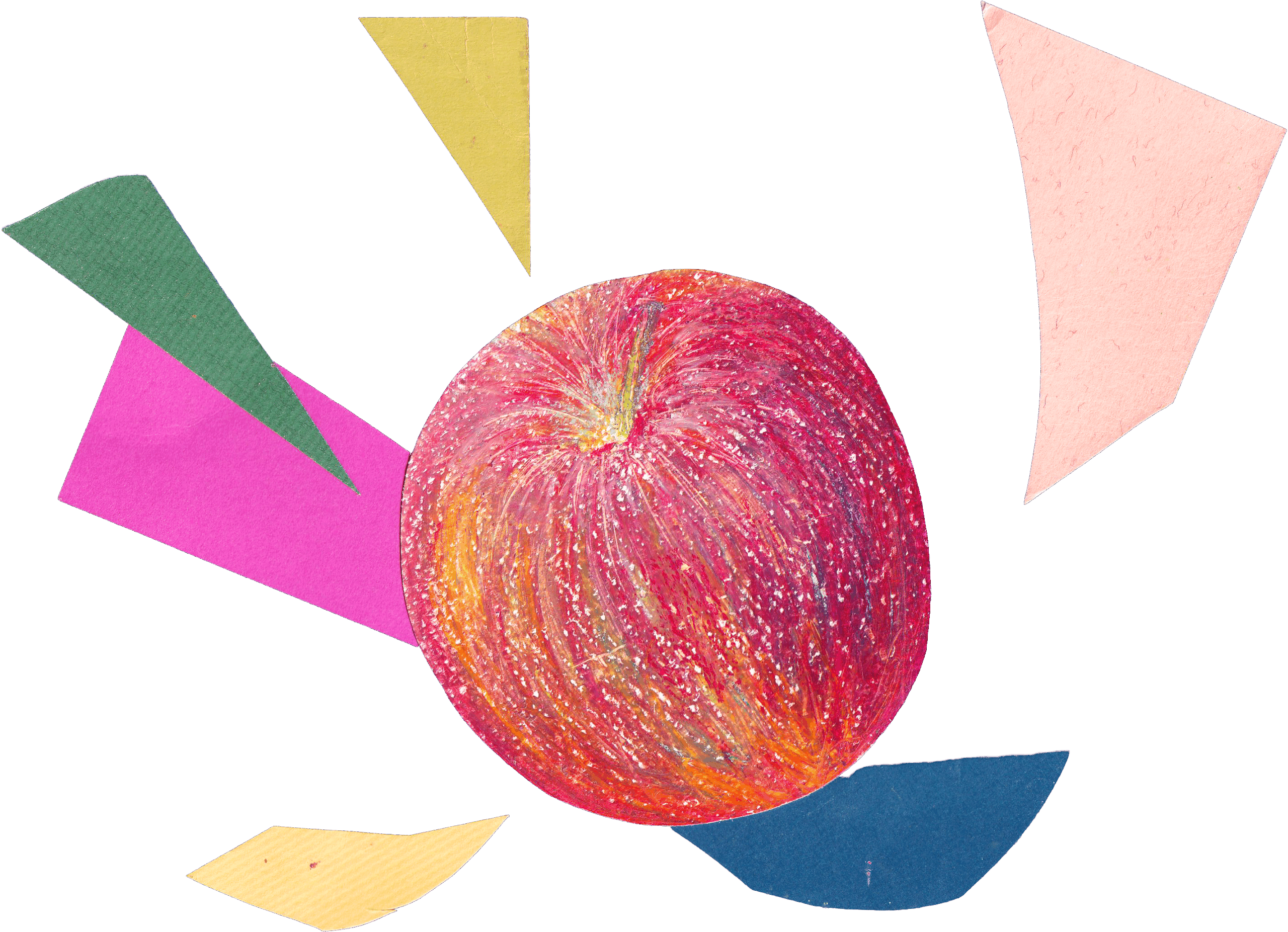 赤や黄、緑の色味、丸みや重み、ツヤや凹みなど、りんごが持つ“存在感”を大きな画面いっぱいに、おもいのままに描いていきます。